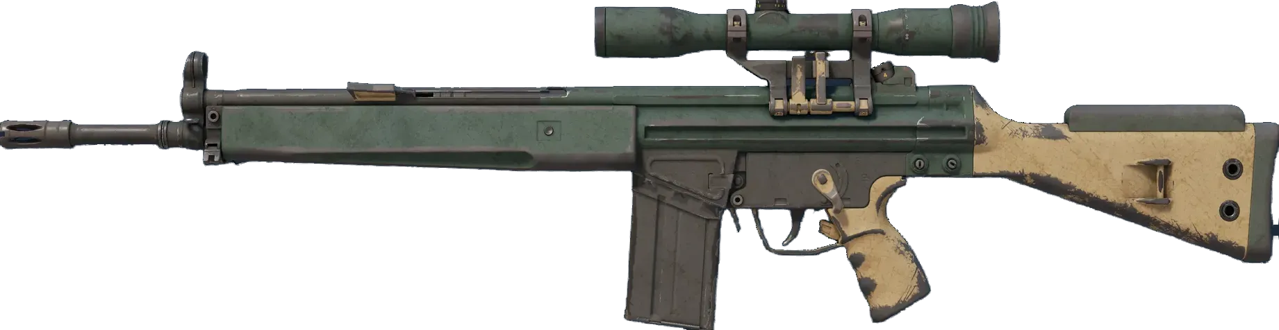 The pricy G3SG1 lowers movement speed considerably but compensates with a higher rate of fire than other sniper rifles. It has individual parts spray-painted tan, navy and dark green. _Rona Sabri still hasn't forgiven Sebastien for not selecting her to go after Turner_