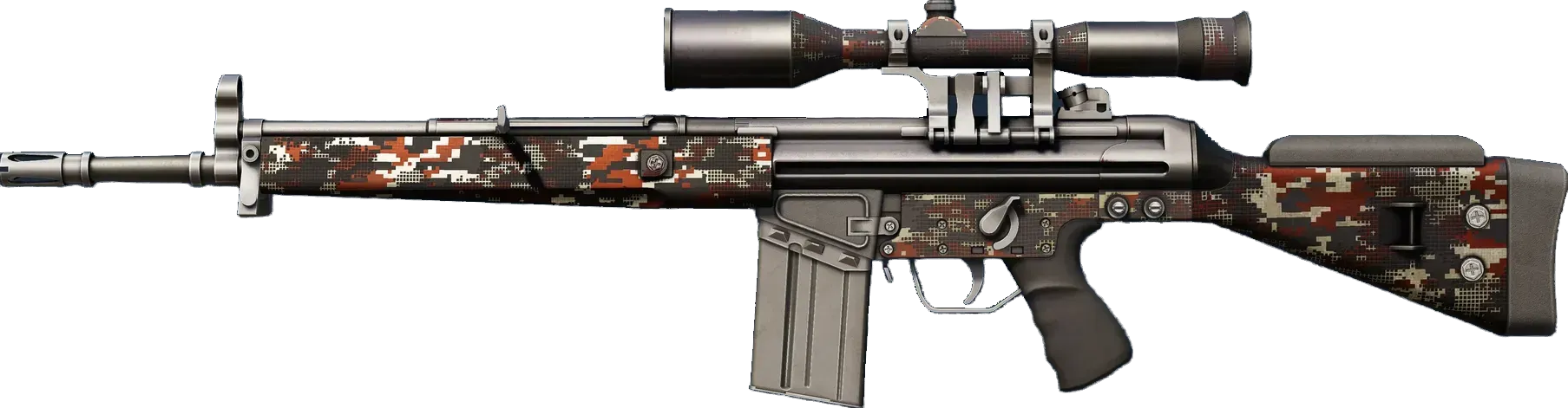 The pricy G3SG1 lowers movement speed considerably but compensates with a higher rate of fire than other sniper rifles. It has been painted with a custom red, white, and charcoal-colored DDPAT pattern. _Disruptingly intricate_