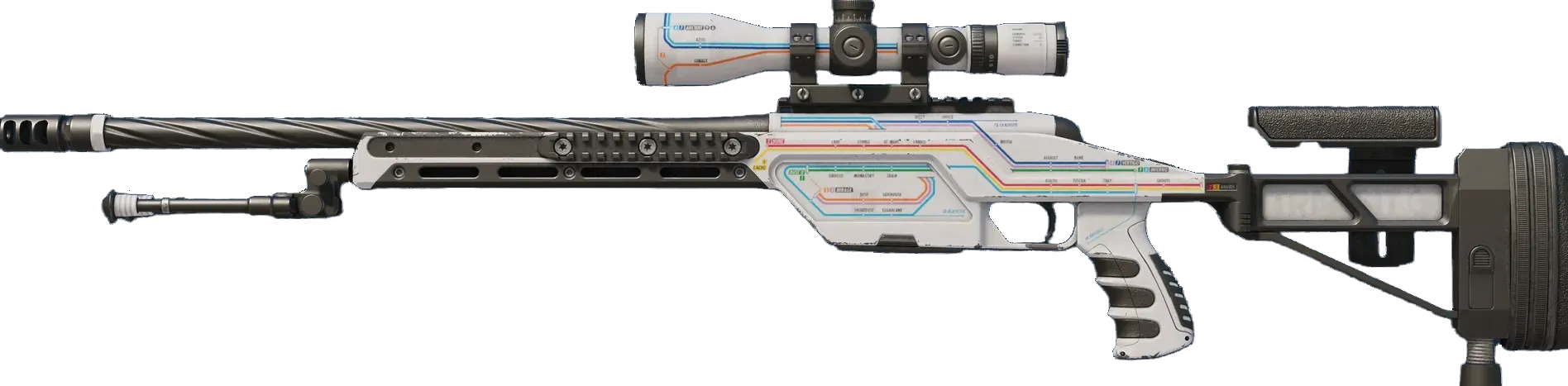 The SSG08 bolt-action is a low-damage but very cost-effective sniper rifle, making it a smart choice for early-round long-range marksmanship. It has been custom painted with fictitious transit diagrams designed around the maps of Counter-Strike. _"Where are we headed?"_