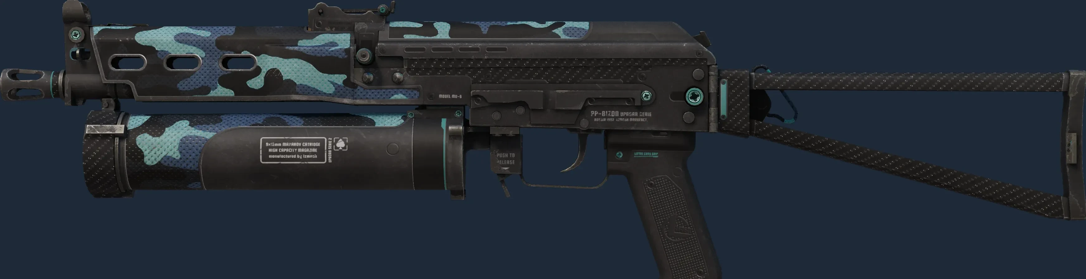 The PP-Bizon | Night Riot is a Covert grade skin for the PP-Bizon in Counter-Strike 2. It features a Custom Paint Job finish and was designed by M1nD.