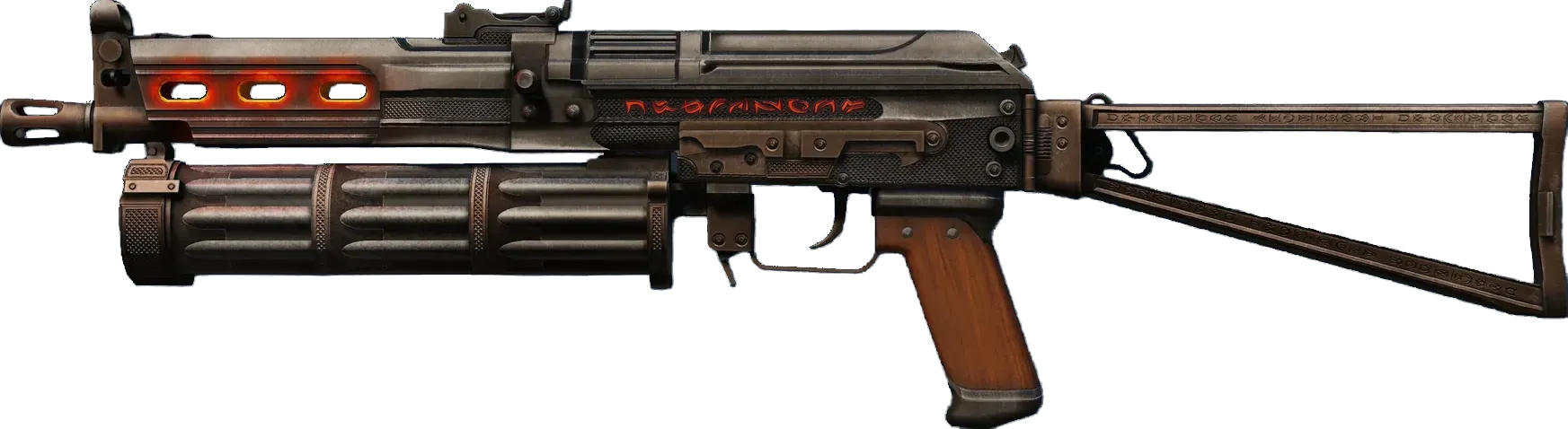 The Bizon SMG is low-damage, but offers a uniquely designed high-capacity drum magazine that reloads quickly. This custom paint job features runes of unknown origin and a magazine that resembles a Gatling gun. _Give 'em hell_