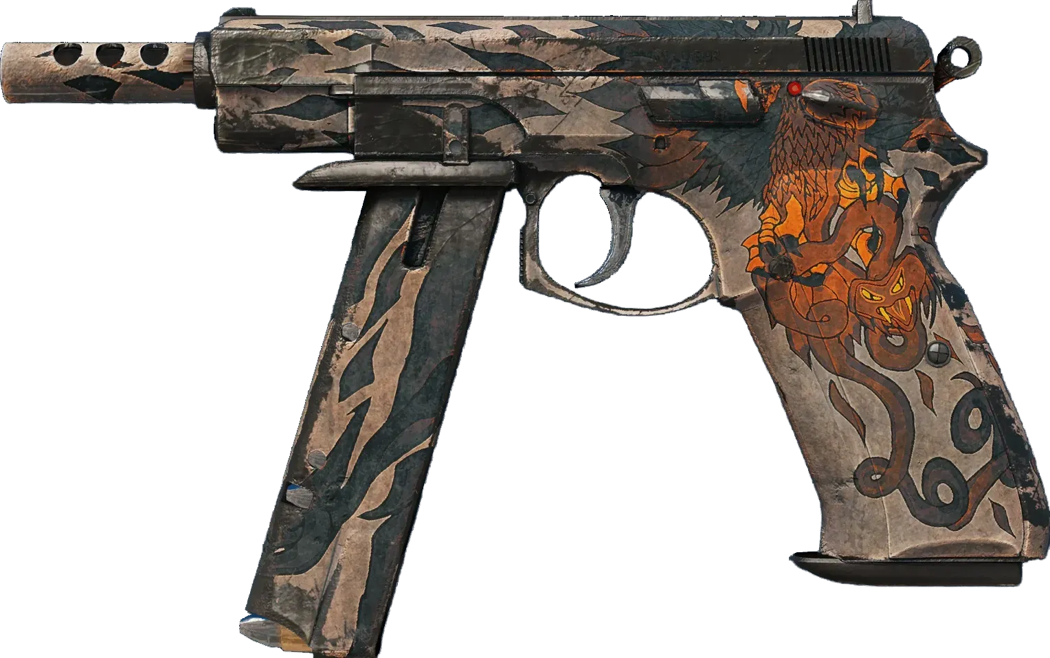 A fully automatic variant of the CZ75, the CZ75-Auto is the ideal short-term choice for turning the tables and gaining your opponents weapon. But with very little ammo in the magazine, strong trigger discipline is required. A bird of prey carrying a snake has been custom painted on this CZ75. _A snake eater, minus the catchy theme song_