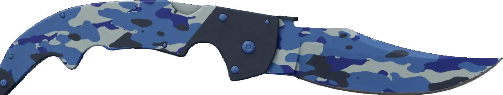 A modern homage to a falchion sword, this clip point blade has a curved edge. It has been painted using a blue camo hydrographic.