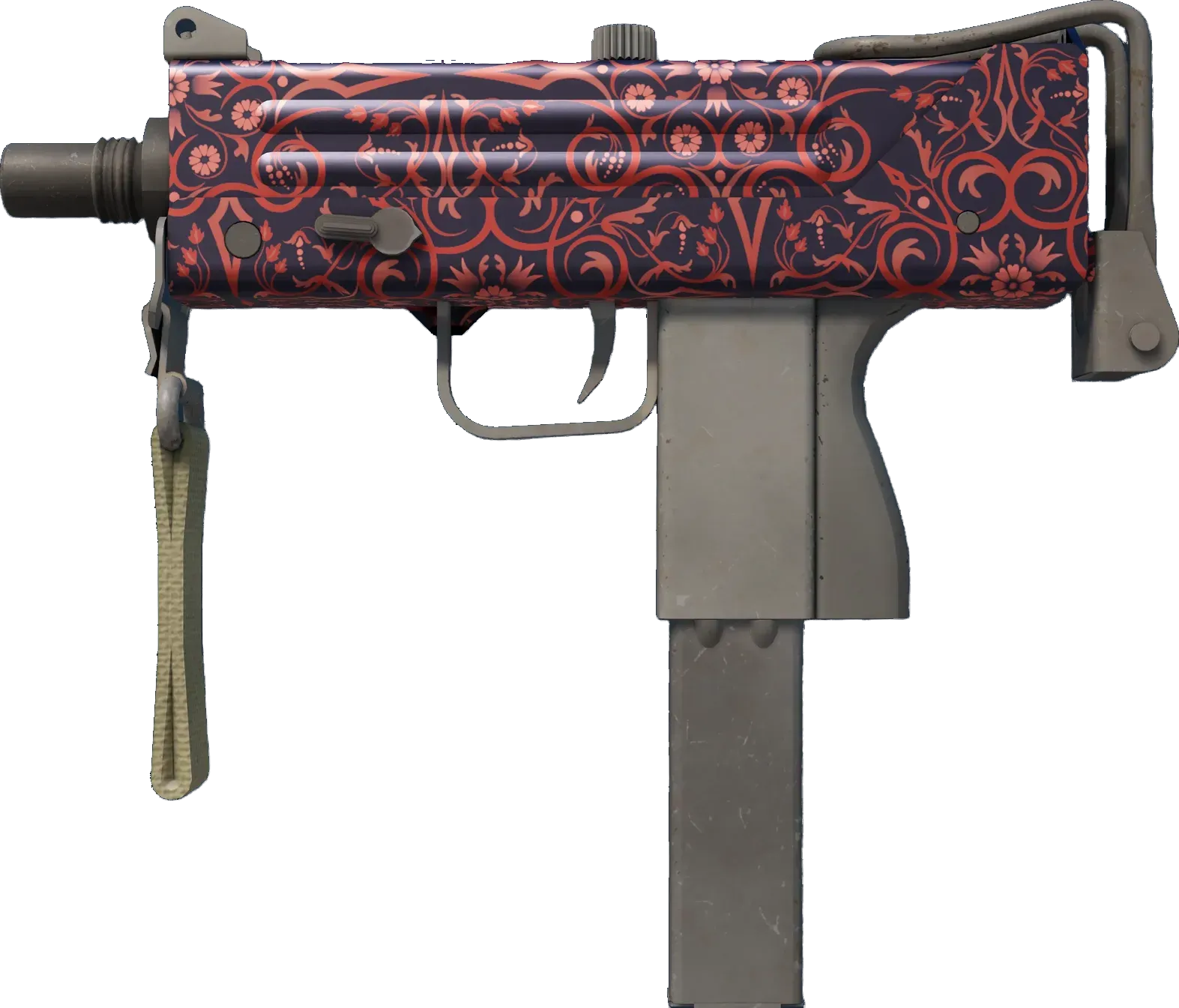 Essentially a box that bullets come out of, the MAC-10 SMG boasts a high rate of fire, with poor spread accuracy and high recoil as trade-offs. A red millefleur hydrographic has been applied. _Perhaps this is one piece of art better left in the past_