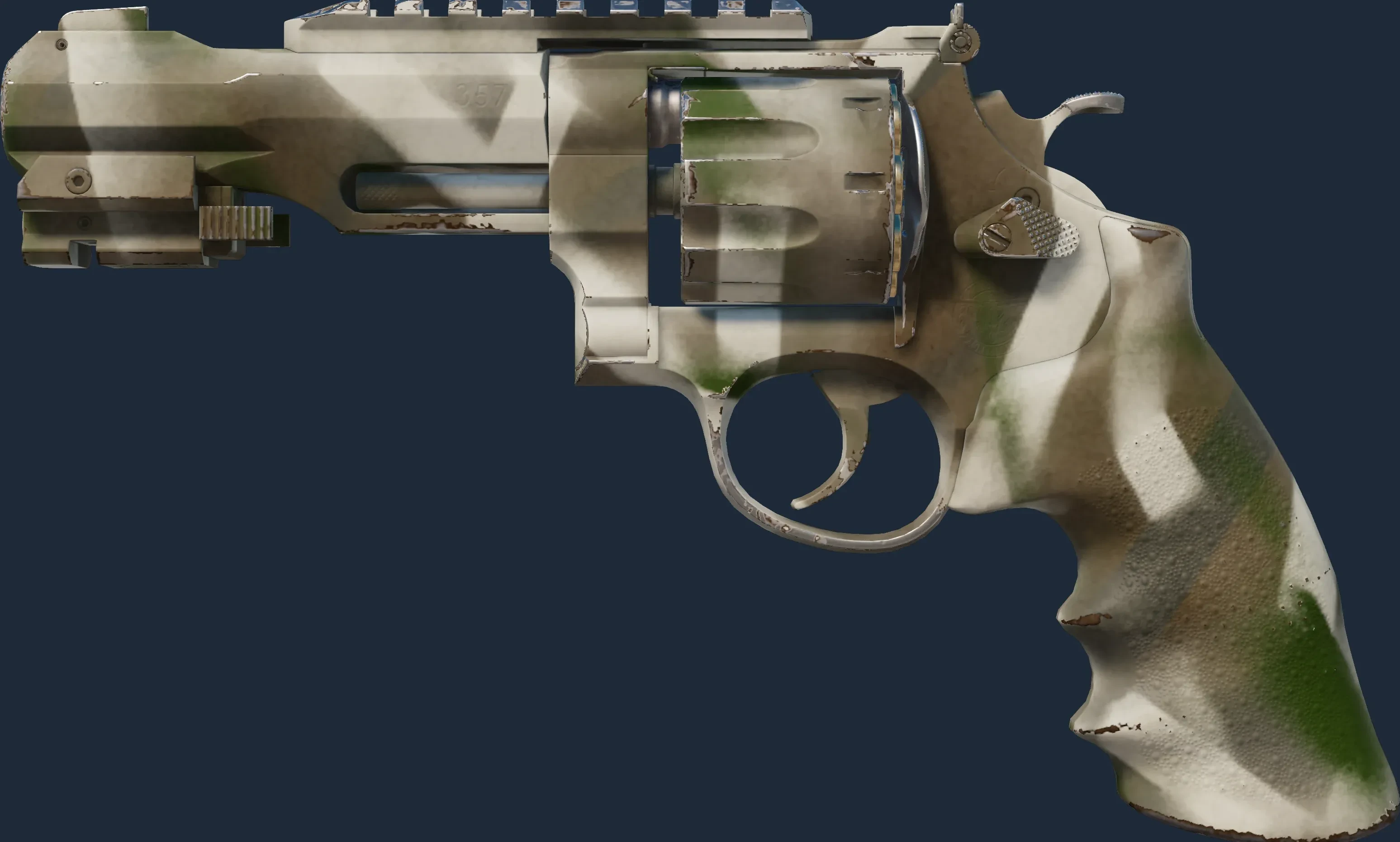 This R8 Revolver has been painted in a "Spray-Paint" style, with the Bone Mask finish. The weapon is spray-painted with multiple coats through stencil patterns. That said, this particular skin has been mostly painted in shades of gray. The look of the Bone Mask finish is affected by its pattern index. The skin uses the new CS2 model.