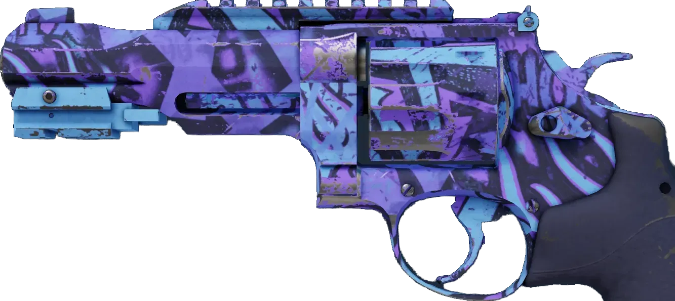The R8 Revolver delivers a highly accurate and powerful round at the expense of a lengthy trigger-pull. Firing rapidly by fanning the hammer may be the best option when point-blank stopping power is required. A multicolored pattern of various Phoenix Connexion graffiti has been applied. _"They cannot stop us now!"_