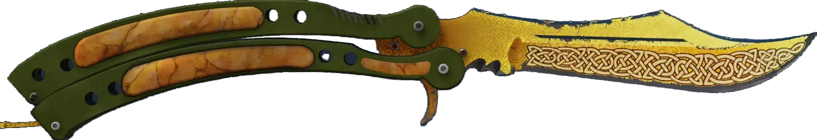 This is a custom-designed balisong, commonly known as a knives/butterfly-knife" class="text-orange-500 hover:underline underline-offset-4 decoration-orange-500/30">butterfly knife. The defining characteristic of this weapon is the fan-like opening of a freely pivoting blade, allowing rapid deployment or concealment. As a result, butterfly knives are outlawed in many countries. It has been custom painted with knotwork.