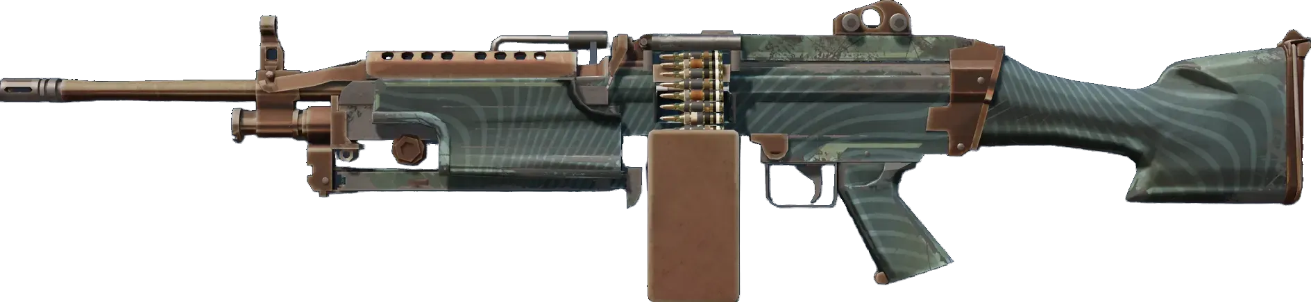 A strong open-area LMG, the M249 is the perfect choice for players willing to trade a slow fire rate for increased accuracy and a high ammo capacity. It has been custom painted using teal-colored desert camouflage and environments as inspiration. _"WE'VE BEEN SET UP! THEY'RE EVERYWHERE!"_
