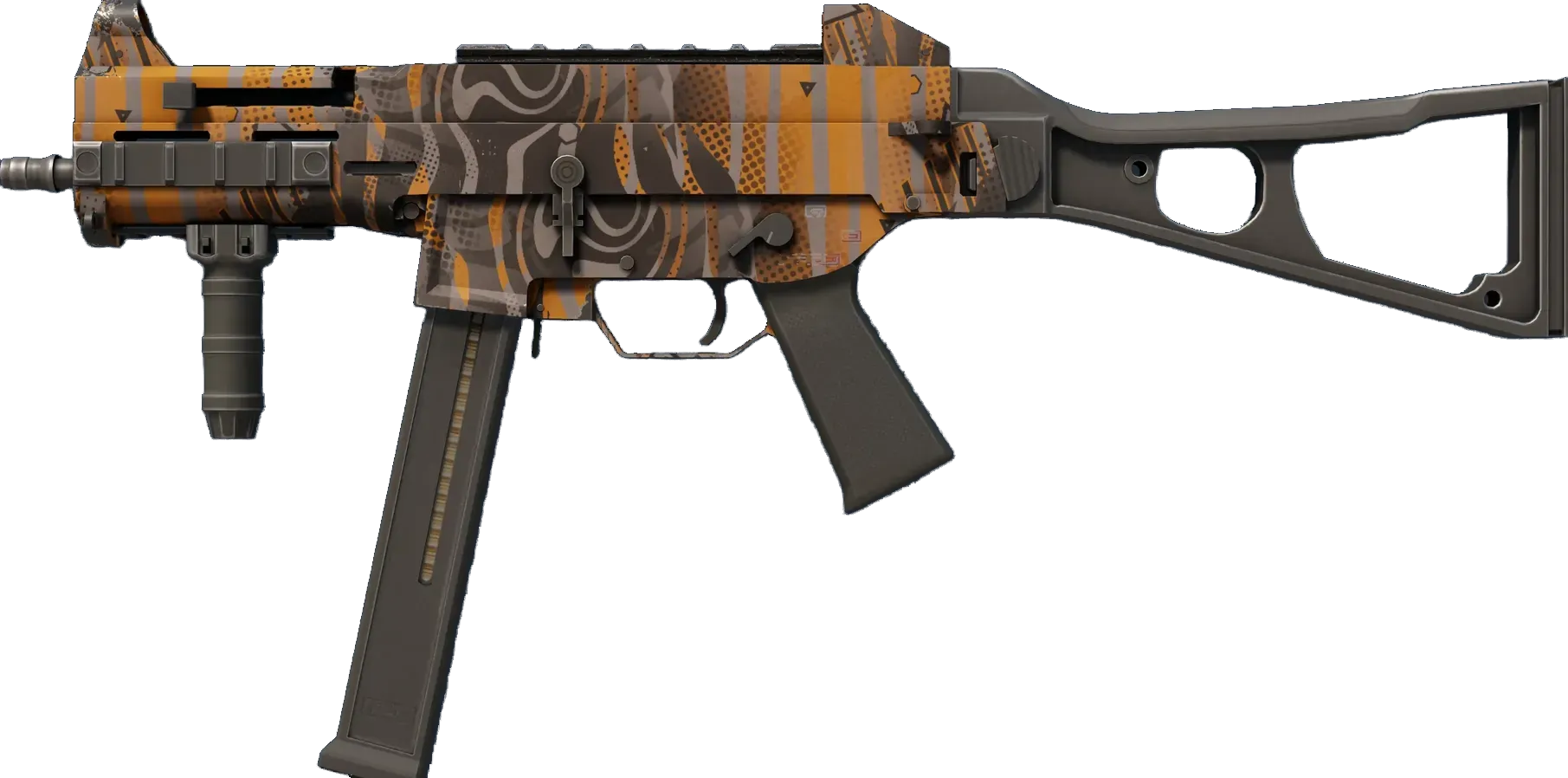 The misunderstood middle child of the SMG family, the UMP45's small magazine is the only drawback to an otherwise versatile close-quarters automatic. A randomized pattern in orange, black, and grey has been applied. _Everyone has a breaking point; where's yours?_