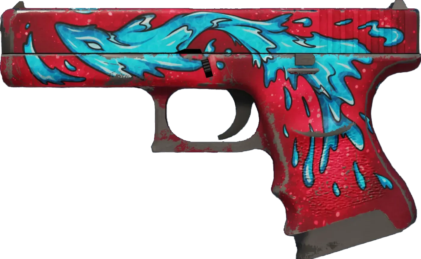 The Glock 18 is a serviceable first-round pistol that works best against unarmored opponents and is capable of firing three-round bursts. It has been custom painted with the image of a creature made of water in a graphic style.