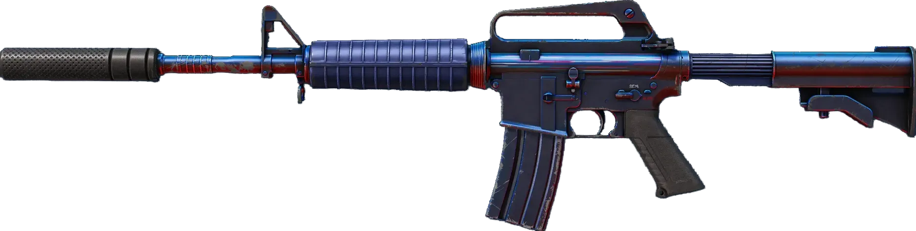 With a smaller magazine than its unmuffled counterpart, the silenced M4A1 provides quieter shots with less recoil and better accuracy. Its dark base and carefully selected red and blue highlights make this custom painted M4A1-S appear as if it's glowing under ambient light. _Quiet reflection_