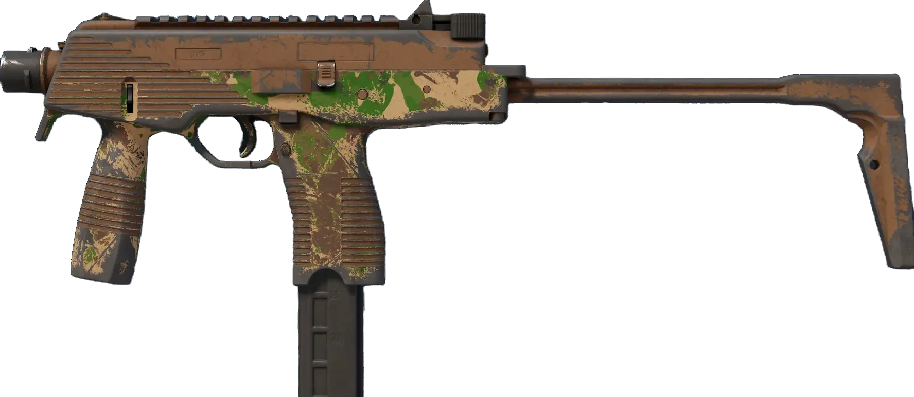 Manufactured in Switzerland, the cutting-edge MP9 SMG is an ergonomic polymer weapon favored by private security firms. A green and brown multi-terrain camo pattern has been applied. _It's an early piece, but it still holds up - Imogen, Arms Dealer In Training_