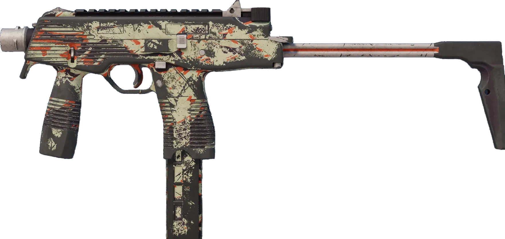 Manufactured in Switzerland, the cutting-edge MP9 SMG is an ergonomic polymer weapon favored by private security firms. A multicolored tiger camo pattern has been applied. _Endangered no more_
