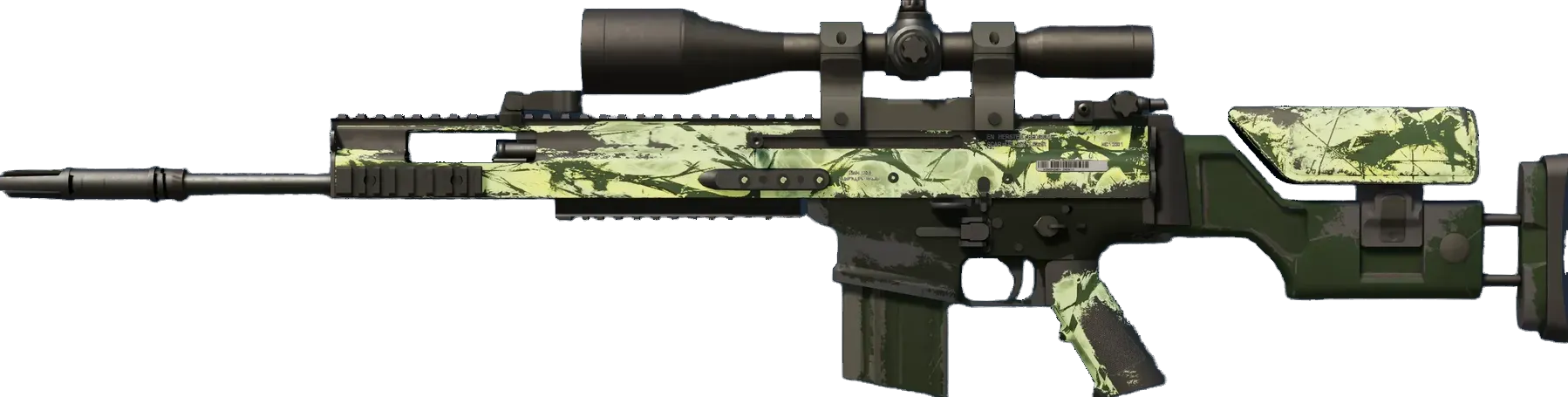 The SCAR-20 is a semi-automatic sniper rifle that trades a high rate of fire and powerful long-distance damage for sluggish movement speed and big price tag. It has been painted with vibrant shades of green. _Valeria is getting bolder... the time has come to take the fight to her - Felix Riley, Commanding Officer_