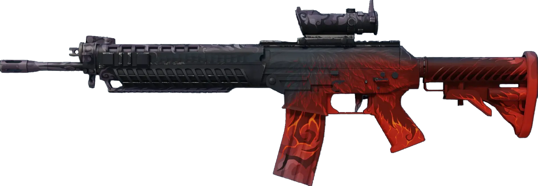 The terrorist-exclusive SG553 is a premium scoped alternative to the AK47 for effective long-range engagement. A red and black custom paint job with feathers and other dark details has been applied. _Eagle eyed and extremely lethal; you won't find a more dangerous flightless bird_