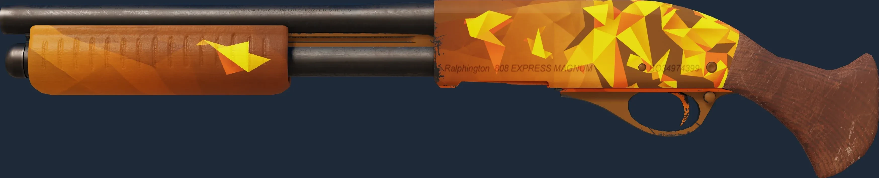 This Sawed-Off has been painted in a "Custom Paint Job" style, with the Origami finish. This style enables extremely customized looks in a full range of colors. The skin has been painted in a color scheme of yellow and brown. Different pattern indexes have no effect on the Origami finish. The skin uses the old legacy model.