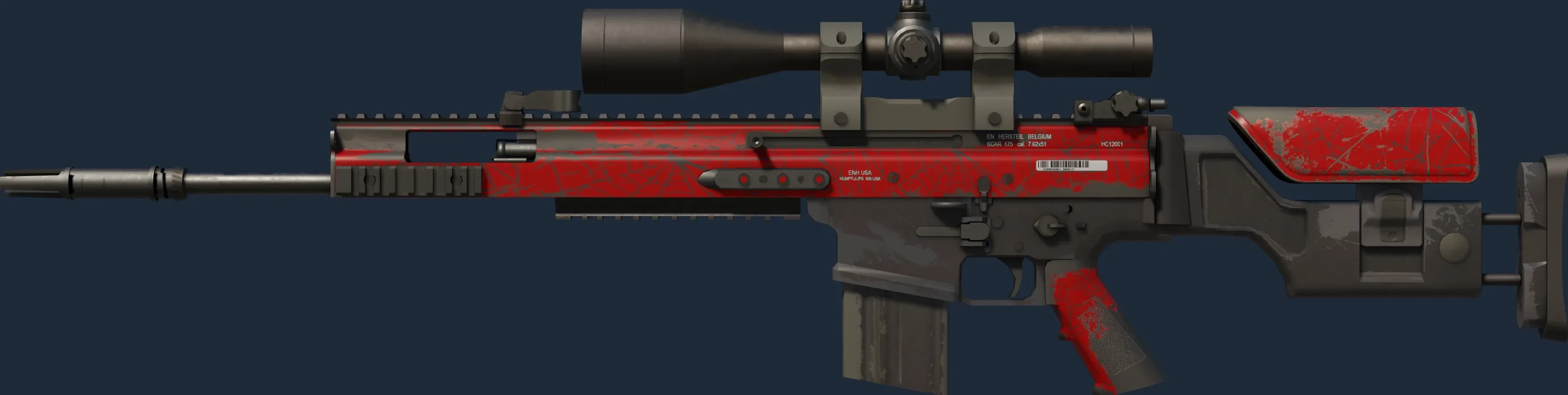 The SCAR-20 | Crimson Web is a Covert grade skin for the SCAR-20 in Counter-Strike 2. It features a Custom Paint Job finish and was designed by Valve.