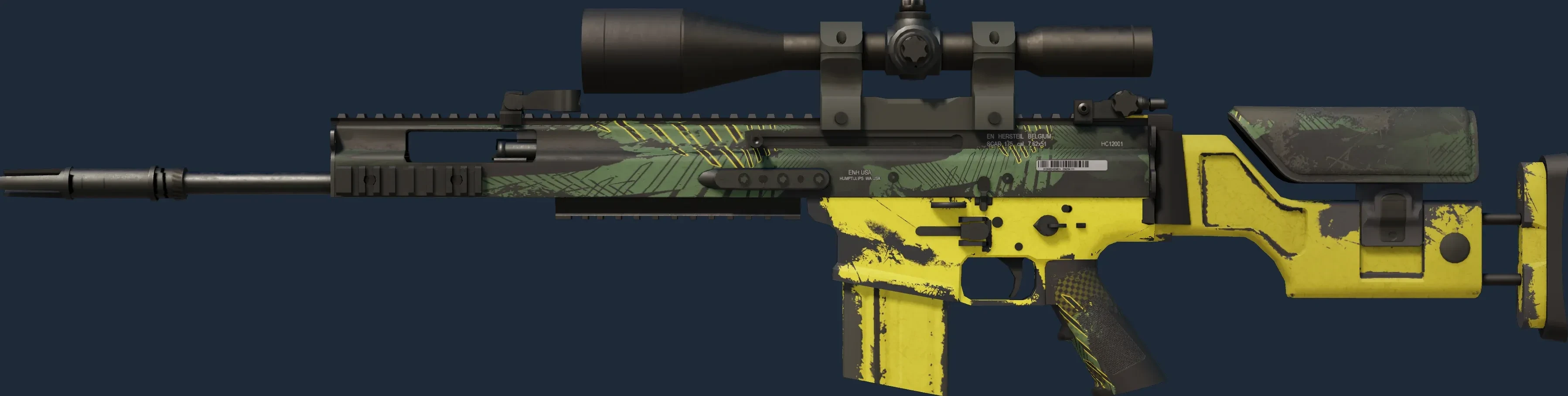 The SCAR-20 | Jungle Slipstream is a Covert grade skin for the SCAR-20 in Counter-Strike 2. It features a Custom Paint Job finish and was designed by Valve.