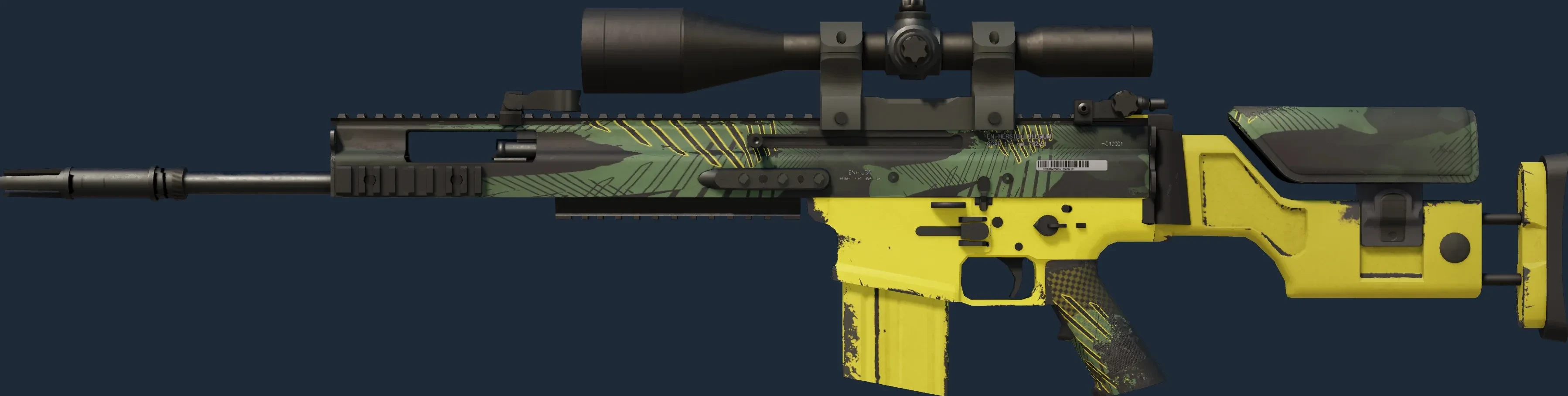The SCAR-20 | Jungle Slipstream is a Covert grade skin for the SCAR-20 in Counter-Strike 2. It features a Custom Paint Job finish and was designed by Valve.