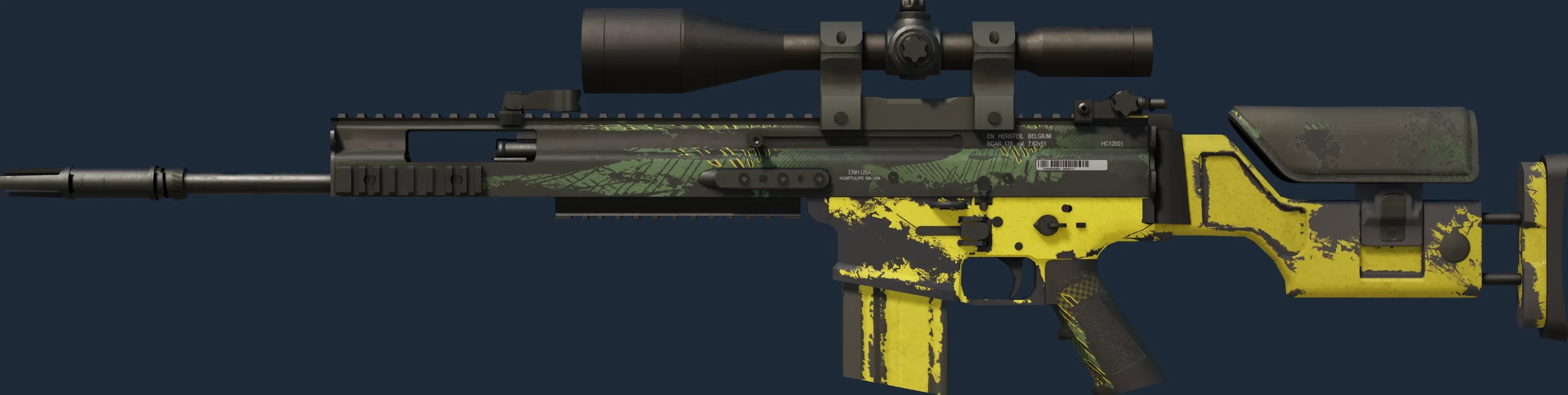 The SCAR-20 | Jungle Slipstream is a Covert grade skin for the SCAR-20 in Counter-Strike 2. It features a Custom Paint Job finish and was designed by Valve.