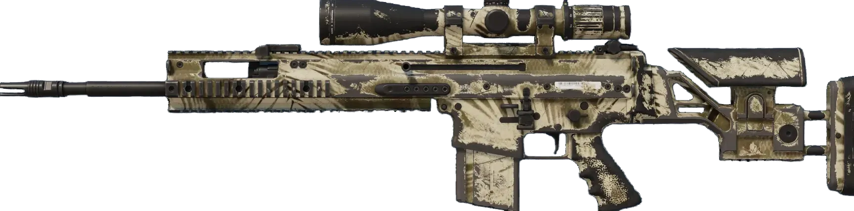The SCAR-20 is a semi-automatic sniper rifle that trades a high rate of fire and powerful long-distance damage for sluggish movement speed and big price tag. It has been spray-painted using cardboard cutouts, fine mesh, and palm leaves as stencils.