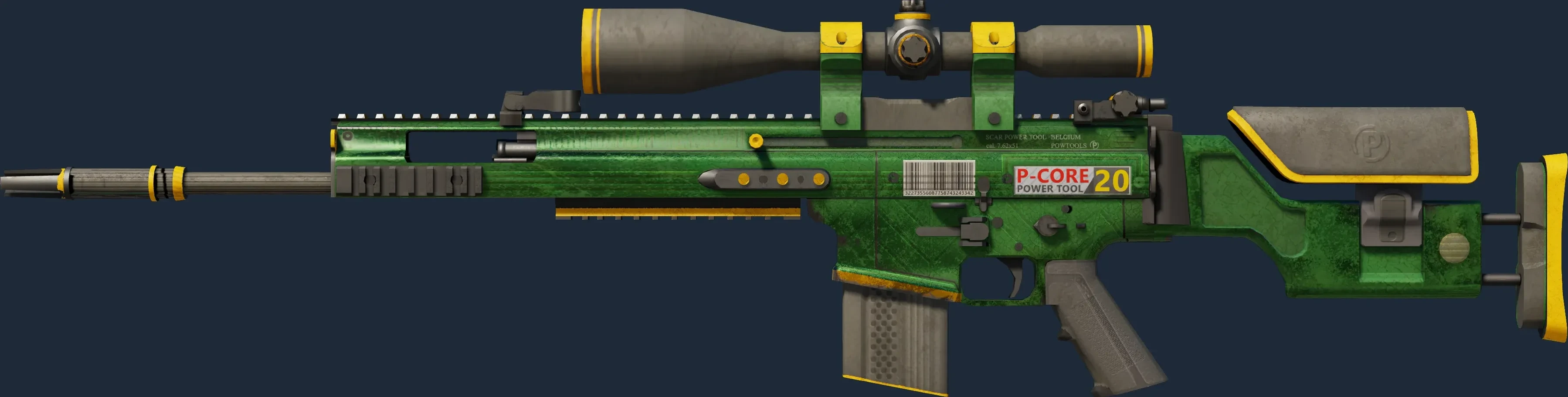 The SCAR-20 | Powercore is a Covert grade skin for the SCAR-20 in Counter-Strike 2. It features a Custom Paint Job finish and was designed by Endrit.