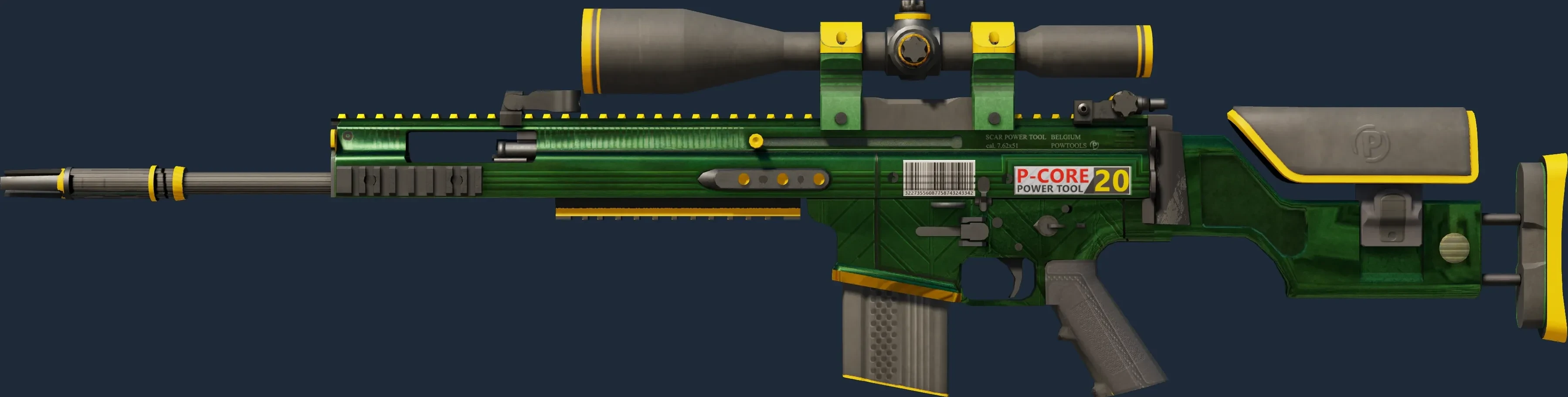 The SCAR-20 | Powercore is a Covert grade skin for the SCAR-20 in Counter-Strike 2. It features a Custom Paint Job finish and was designed by Endrit.