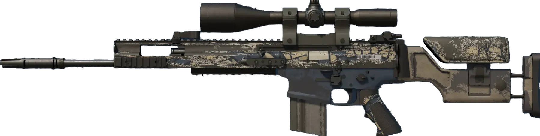 The SCAR-20 is a semi-automatic sniper rifle that trades a high rate of fire and powerful long-distance damage for sluggish movement speed and big price tag. It has been painted with a tan colored cracked tile hydrographic. _Watch your step_