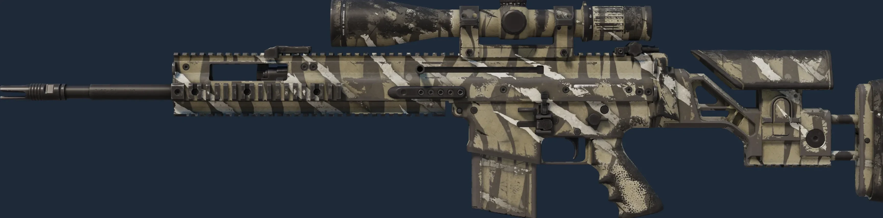 The SCAR-20 is a semi-automatic sniper rifle that trades a high rate of fire and powerful long-distance damage for sluggish movement speed and big price tag. It has been spray-painted with a randomized stripe pattern. _To shreds..._