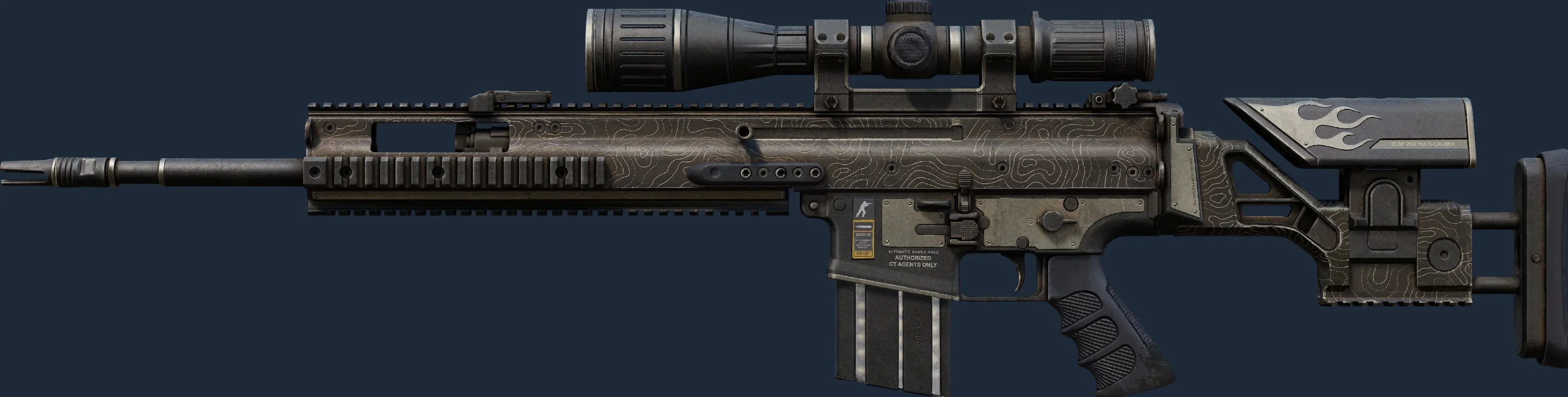 This SCAR-20 has been painted in a "Gunsmith" style, with the Trail Blazer finish. This style uses a combination of patina and custom paint styles. That said, this particular skin has been mostly painted in shades of gray. Different pattern indexes have no effect on the Trail Blazer finish. The skin uses the new CS2 model.