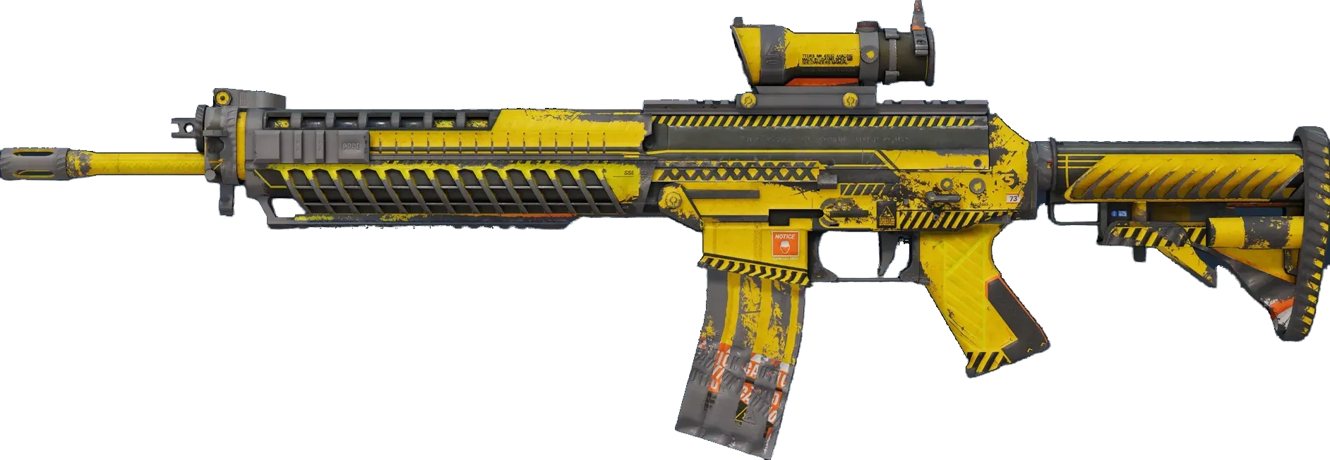 The terrorist-exclusive SG553 is a premium scoped alternative to the AK47 for effective long-range engagement. It has been custom painted with a yellow base and traffic cone orange accents. _Throw caution to the wind one bullet at a time_