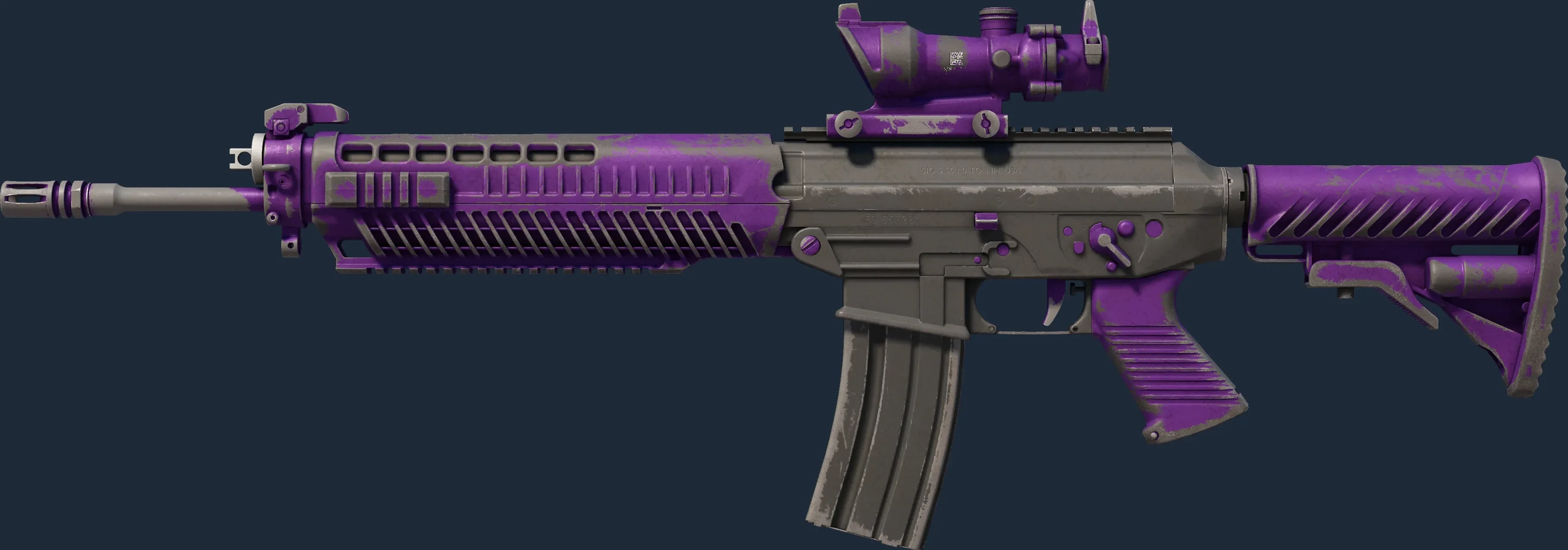 The SG 553 | Ultraviolet is a Covert grade skin for the SG 553 in Counter-Strike 2. It features a Custom Paint Job finish and was designed by Valve.