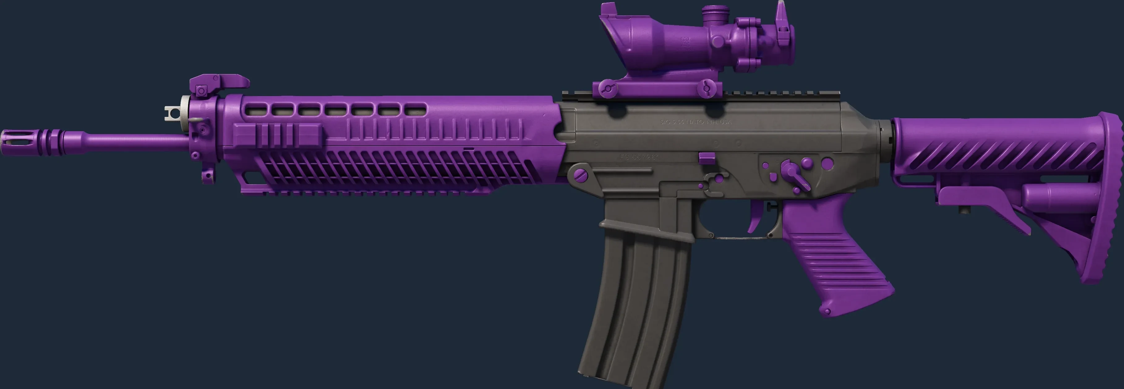 The SG 553 | Ultraviolet is a Covert grade skin for the SG 553 in Counter-Strike 2. It features a Custom Paint Job finish and was designed by Valve.