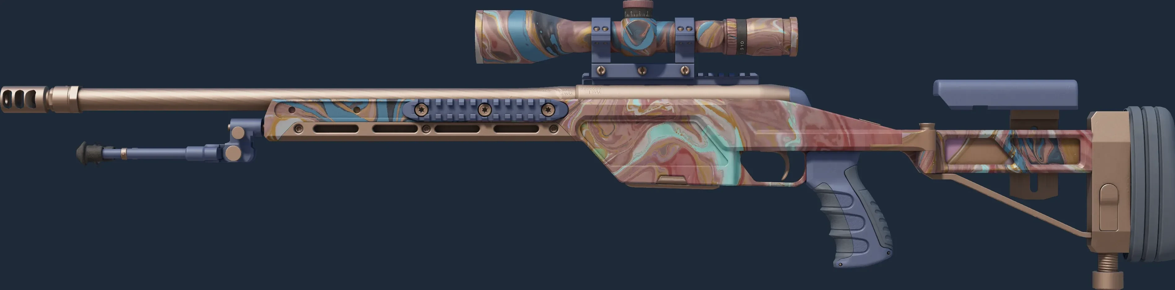 The SSG08 bolt-action is a low-damage but very cost-effective sniper rifle, making it a smart choice for early-round long-range marksmanship. A blush, gold, and blue-colored acrylic pour pattern has been applied. _It all comes together..._