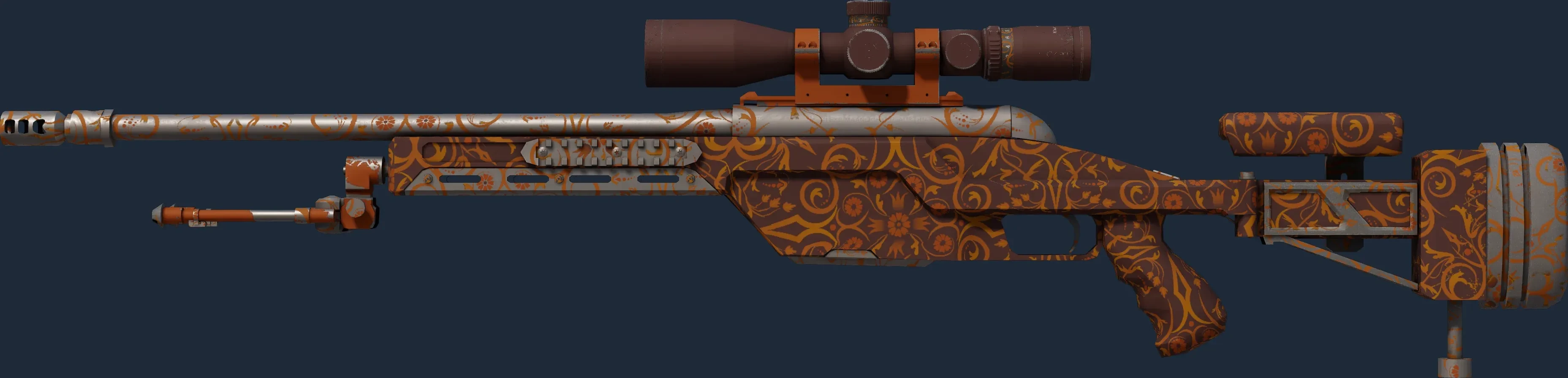 This SSG 08 has been painted in a "Hydrographic" style, with the Orange Filigree finish. Disassembled weapon parts are lowered through a floating hydrographic film on the surface of a water tank. The film adheres to the primed weapon parts, covering the surface with a pattern. The primary color of this skin is composed of a brown tint. The look of the Orange Filigree finish is affected by its pattern index. The skin uses the old legacy model.