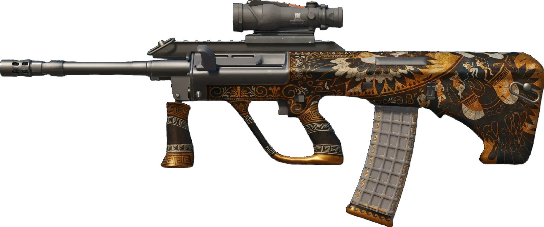 Powerful and accurate, the AUG scoped assault rifle compensates for its long reload times with low spread and a high rate of fire. It has been custom painted to depict stymphalian birds from Greek mythology. _Artemis sends her regards_