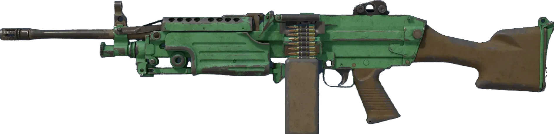 A strong open-area LMG, the M249 is the perfect choice for players willing to trade a slow fire rate for increased accuracy and a high ammo capacity. It has individual parts spray-painted solid colors in a jungle color scheme.