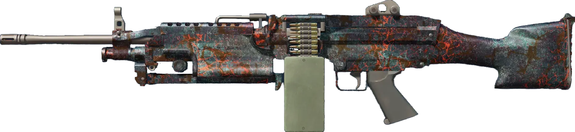 A strong open-area LMG, the M249 is the perfect choice for players willing to trade a slow fire rate for increased accuracy and a high ammo capacity. It has copper plated parts that have been masked in a magma pattern and given a red patina using sodium chloride and high heat. Unmasked areas have subsequently been darkened via oxidization using liver of sulfur. _A burning rate of fire_