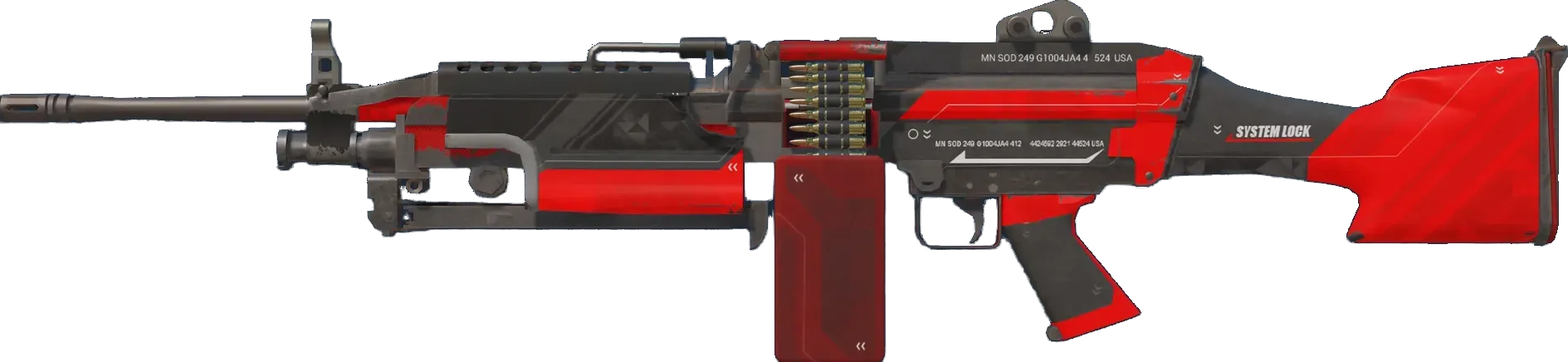 M249 | System Lock är ett av 49 andra N/A-skins. Sällsyntheten på skinnet är Mil-Spec Grade, vilket gör System Lock till ett vanligt drop med en uppskattad drop-chans på bara N/A%.