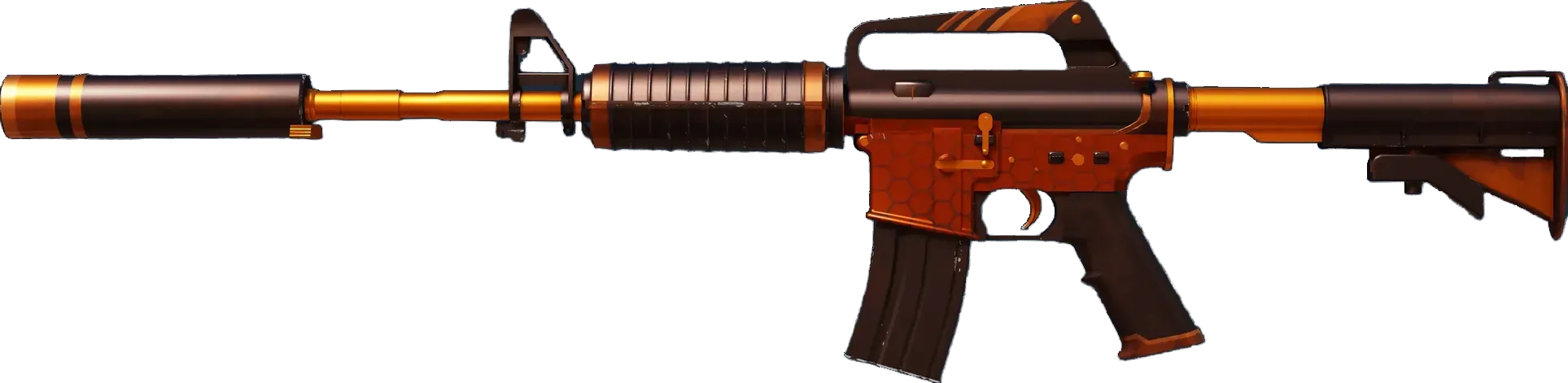 With a smaller magazine than its unmuffled counterpart, the silenced M4A1 provides quieter shots with less recoil and better accuracy. It has been anodized black and orange.