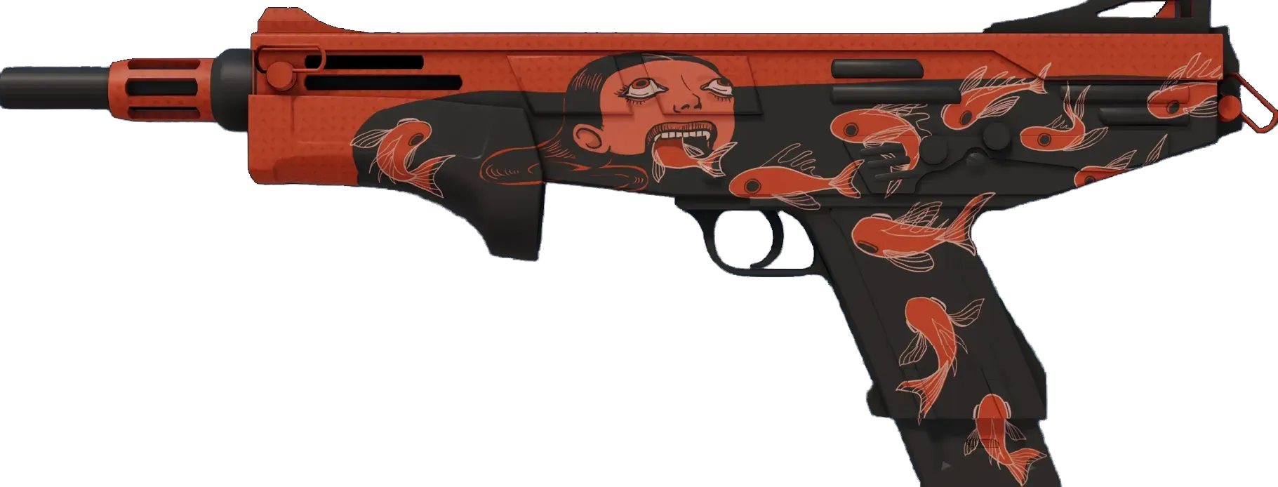 The CT-exclusive Mag-7 delivers a devastating amount of damage at close range. Its rapid magazine-style reloads make it a great tactical choice. It has been custom painted with a design depicting fish swimming into a person's mouth using an orange and black color palette. _Gulp, gulp, gulp_