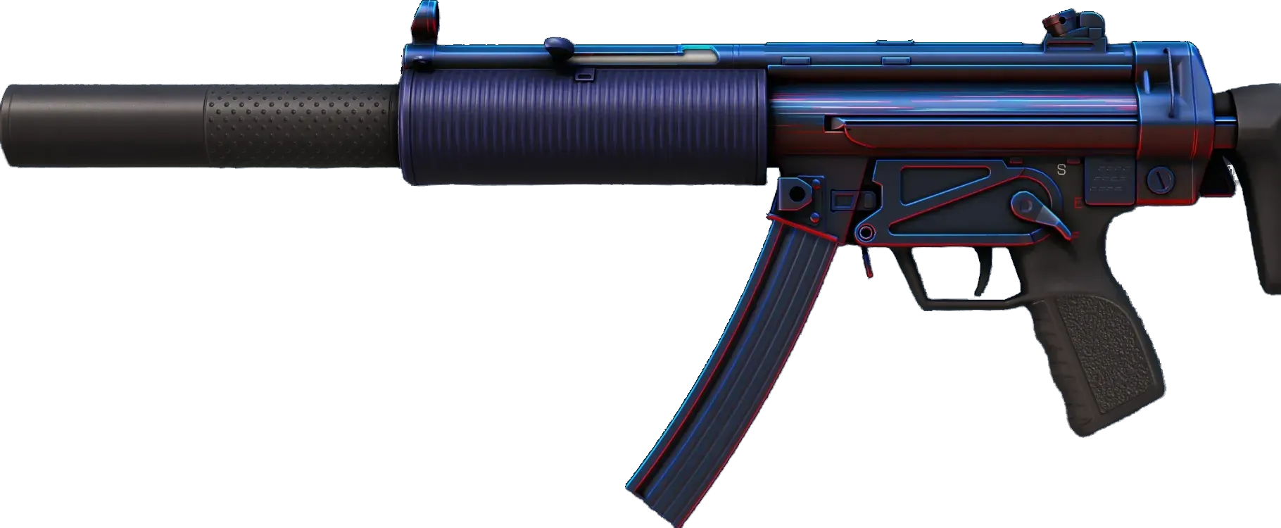 Often imitated but never equaled, the iconic MP5 is perhaps the most versatile and popular SMG in the world. This SD variant features an integrated silencer, making an already formidable weapon whisper-quiet. Its dark base and carefully selected red and blue highlights make this custom painted MP5-SD appear as if it's glowing under ambient light. _Quiet reflection_