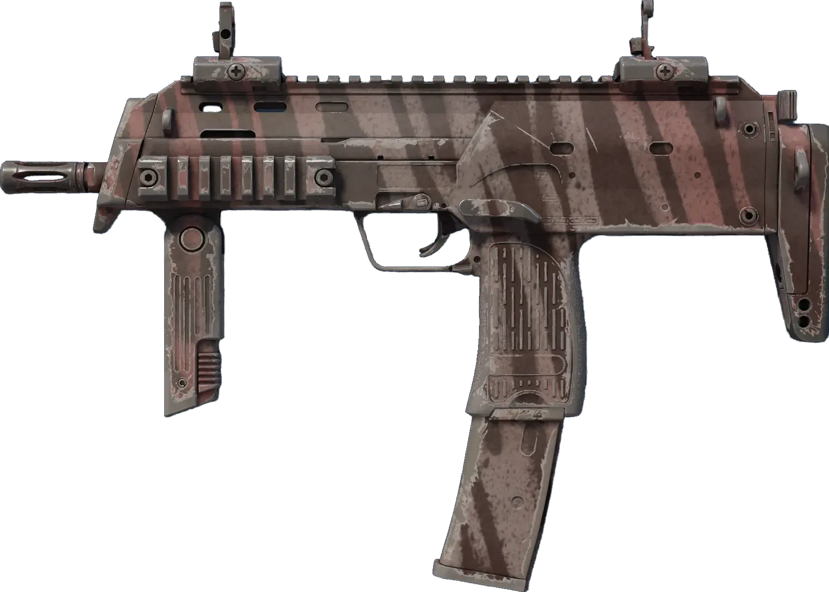 Versatile but expensive, the German-made MP7 SMG is the perfect choice for high-impact close-range combat. It has been spray-painted with a rust colored zebra stripe pattern. _Eat, sleep, hunt, repeat_