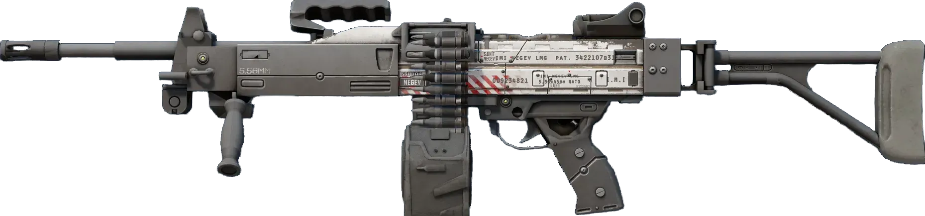 The Negev is a beast that can keep the enemy at bay with its pin-point supressive fire, provided you have the luxury of time to gain control over it. It has been custom painted in white and red, a temporary paint job while its design is finalized. _v1.2.1, PAT. 3422107_