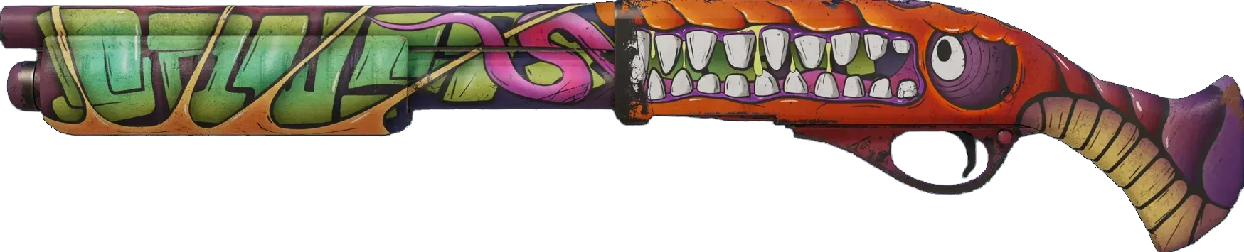The classic Sawed-Off deals very heavy close-range damage, but with its low accuracy, high spread and slow rate of fire, you'd better kill what you hit. It has been hand painted to resemble a creature eating its words. _It's rude to talk with food in your mouth_