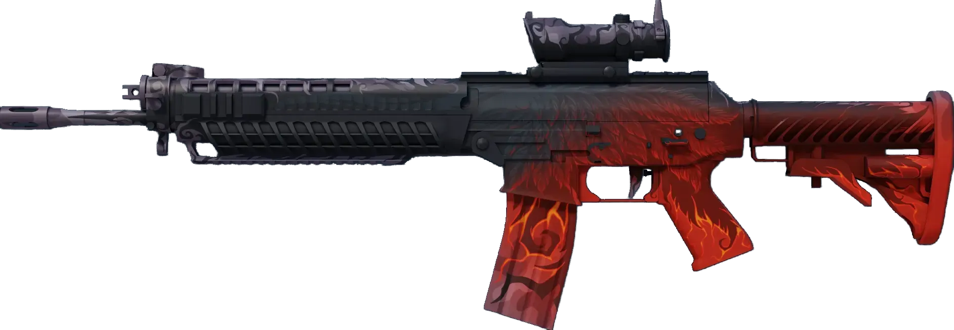 The terrorist-exclusive SG553 is a premium scoped alternative to the AK47 for effective long-range engagement. A red and black custom paint job with feathers and other dark details has been applied. _Eagle eyed and extremely lethal; you won't find a more dangerous flightless bird_
