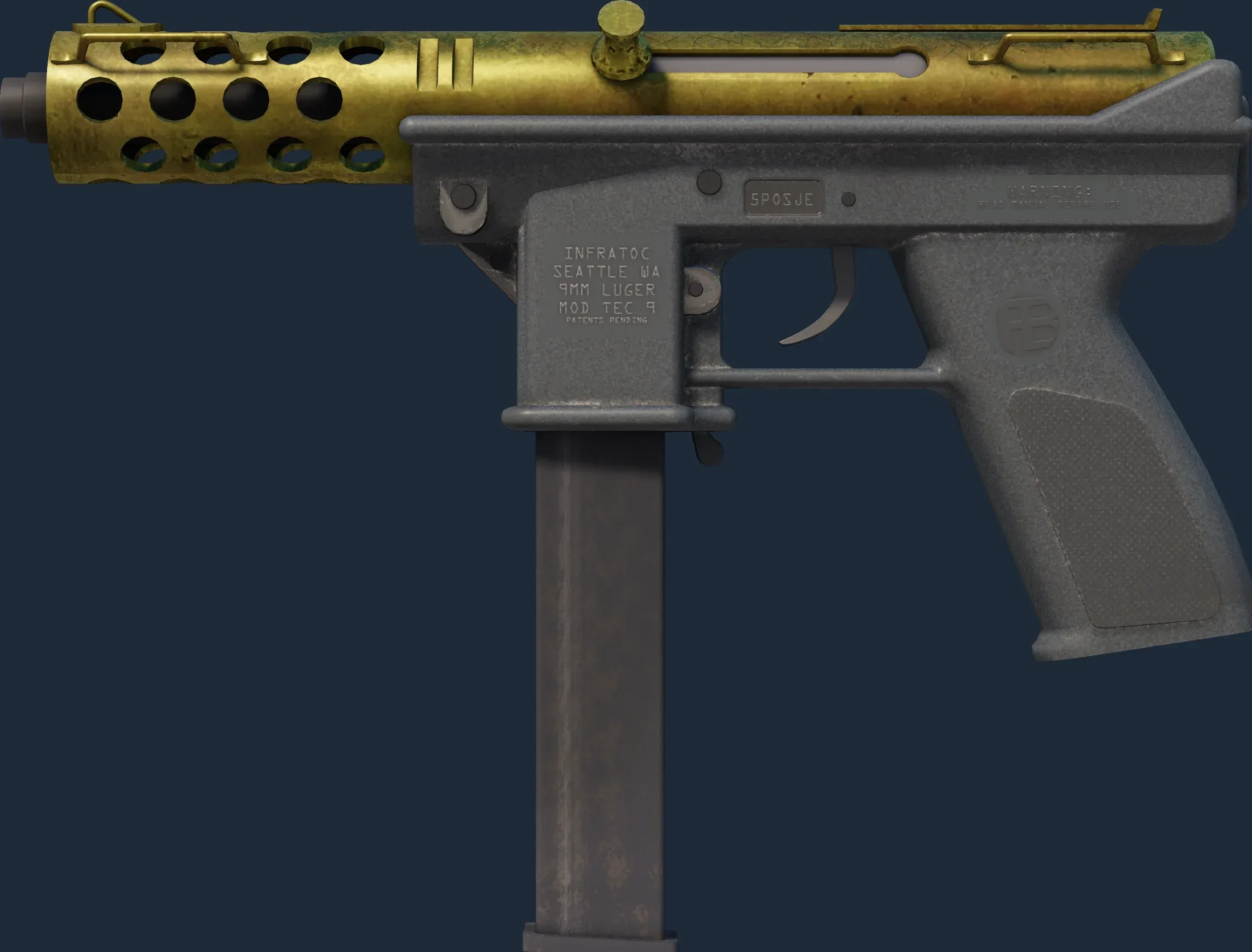The Tec-9 | Brass is a Covert grade skin for the Tec-9 in Counter-Strike 2. It features a Custom Paint Job finish and was designed by Valve.