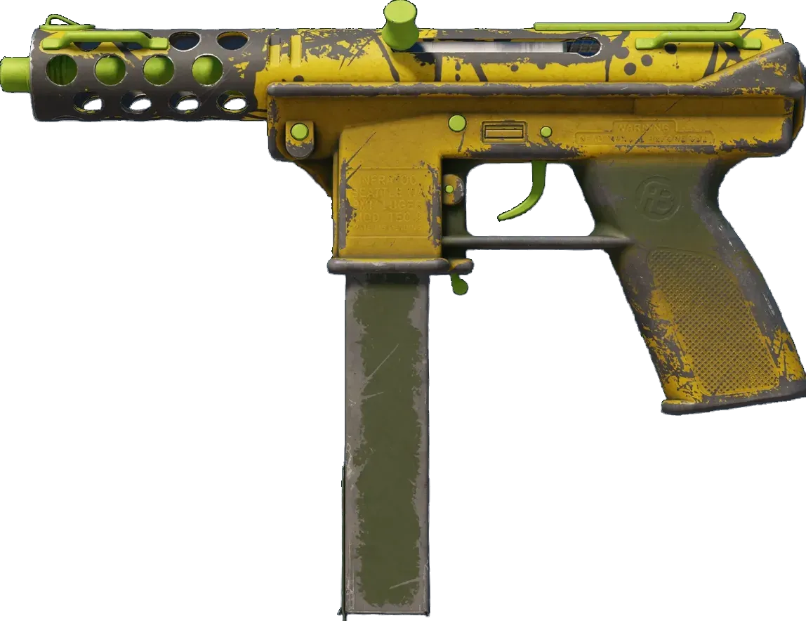 An ideal pistol for the Terrorist on the move, the Tec-9 is lethal in close quarters and features a high magazine capacity. A dark paint splat pattern is applied over a yellow and green base. _Warm regards_