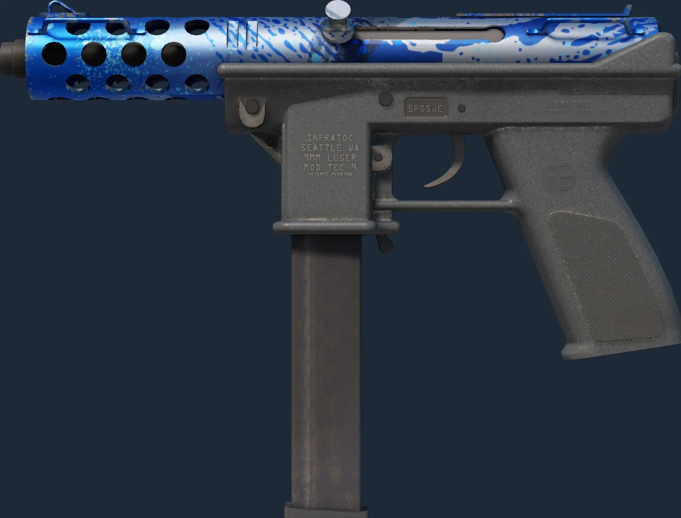 An ideal pistol for the Terrorist on the move, the Tec-9 is lethal in close quarters and features a high magazine capacity. It has been painted with a blue and white abstract hydrographic. _Submerge the opposition_