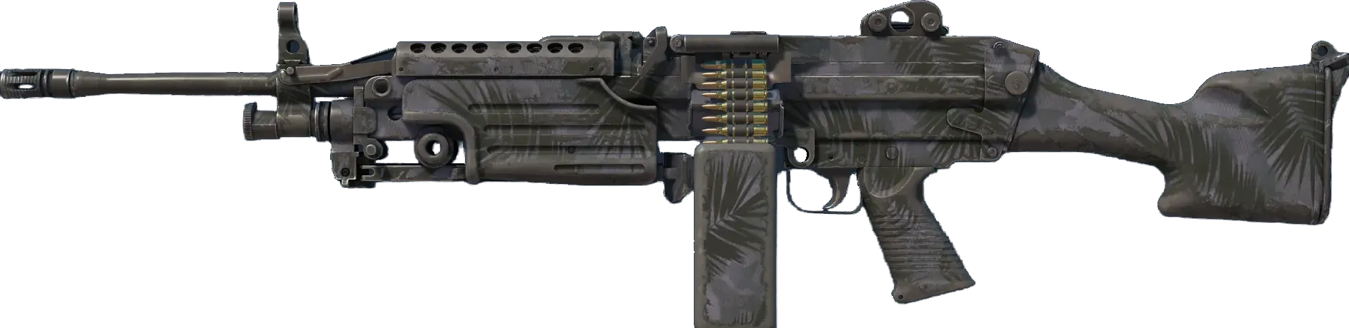 A strong open-area LMG, the M249 is the perfect choice for players willing to trade a slow fire rate for increased accuracy and a high ammo capacity. It has been spray-painted with black palm fronds over a gray and purple camo. _"The sign says closed!"_